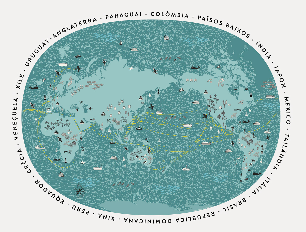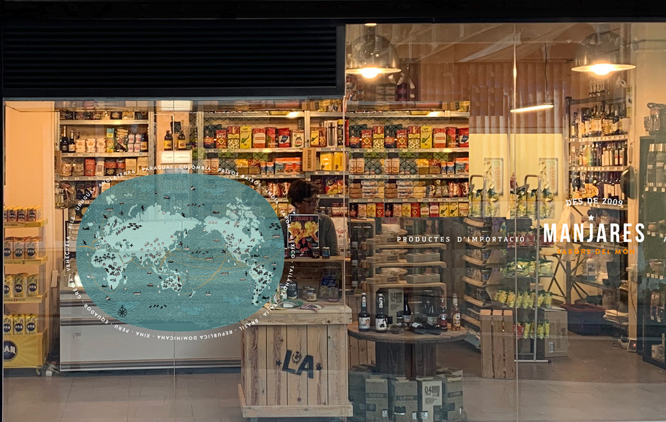 La ilustración, de 130 cm de ancho, representa las rutas comerciales mundiales de alimentos por vía marítima. Realizada en estilo vectorial, fue impresa con una técnica que permite su visualización tanto desde el exterior como desde el interior de la tienda, integrándose armónicamente en el espacio y reforzando el concepto del proyecto.